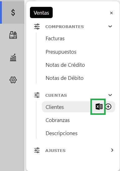 Para acceder, ingresá desde el panel izquierdo de funciones en: Ventas → Cuentas → Clientes. Luego hacé clic en el ícono de Excel que se encuentra al lado de la sección Clientes.