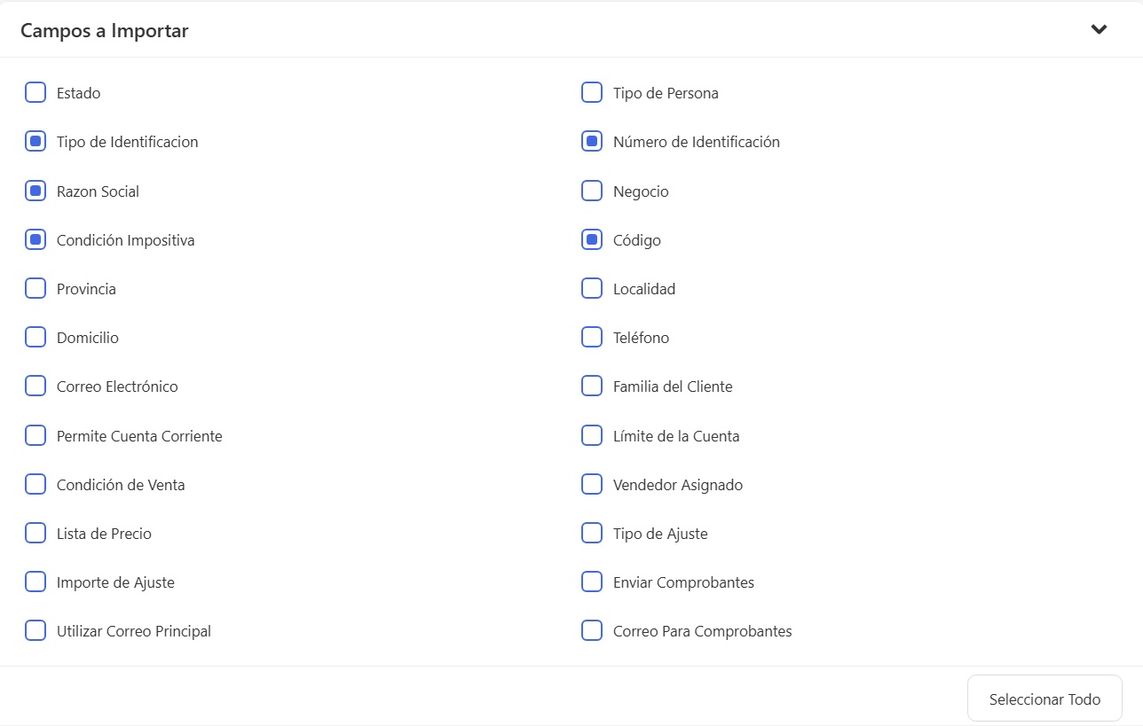 - Seleccionar campos: Marcá los campos que quieras que aparezcan en el archivo de Excel. Ejemplo: Razón Social, CUIT, Provincia, Teléfono, Correo electrónico, etc.