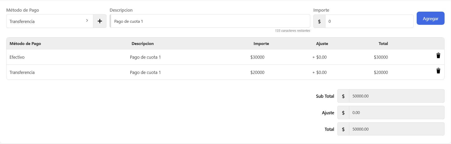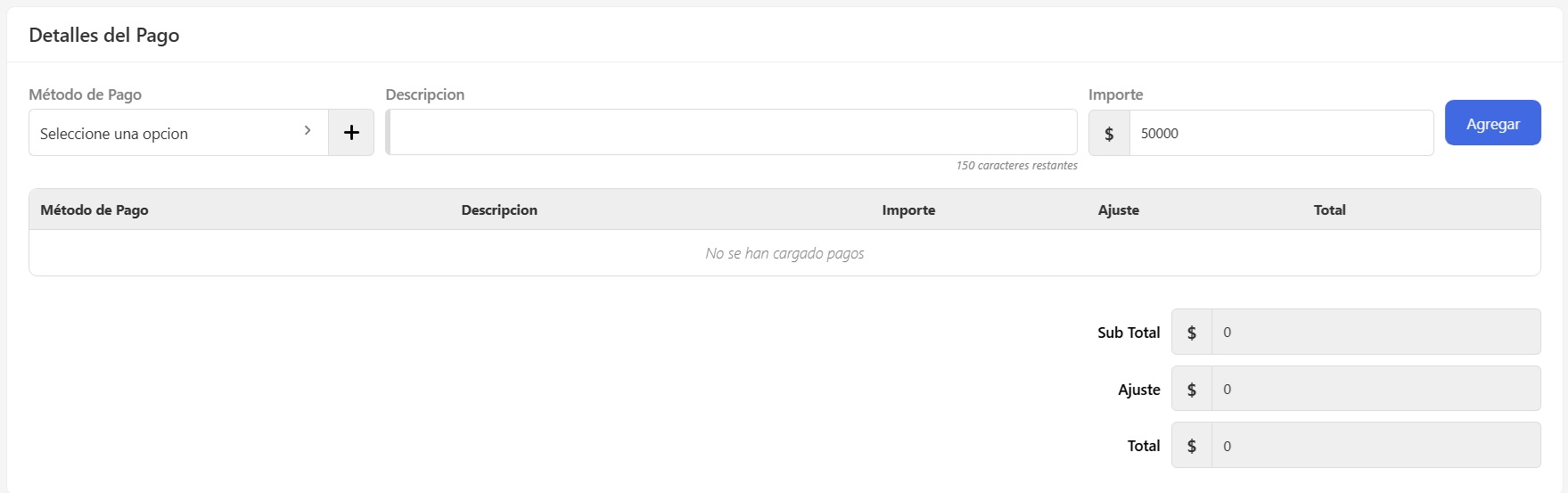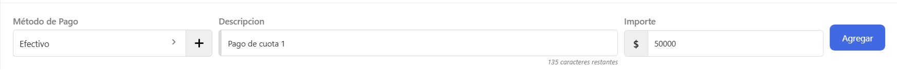 Selecciona el método de pago, agregá una descripción (opcional), completá con el importe y dale al botón Agregar