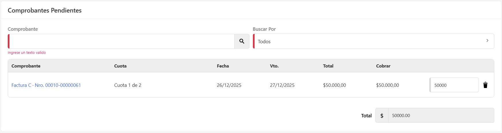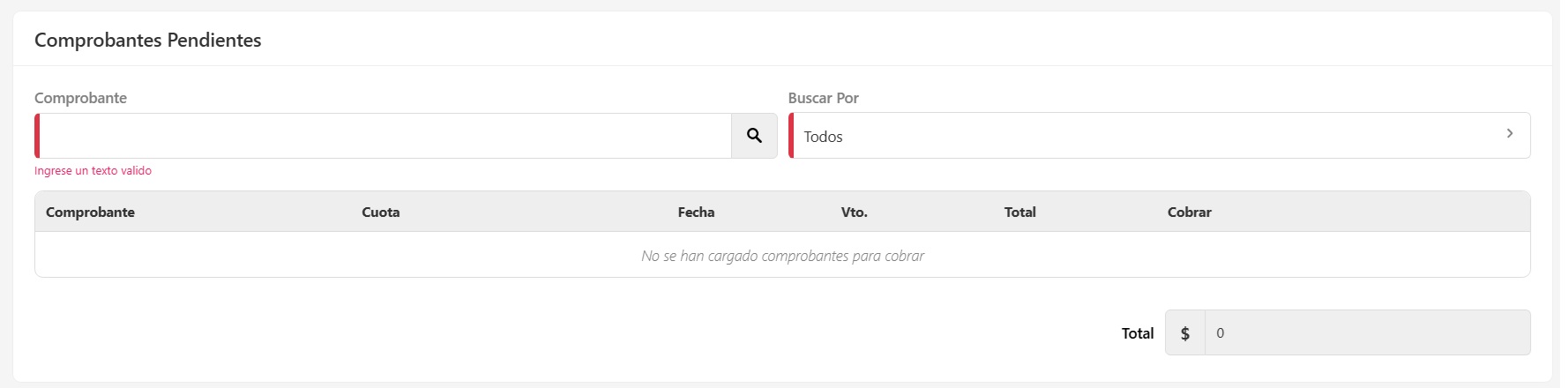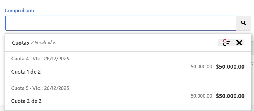 En esta sección realizá la búsqueda de los comprobantes con sus respectivas cuotas para asociar a la cobranza que querés generar.