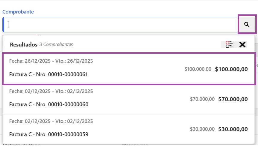 Tip: seleccionando el cliente y haciendo clic directamente en la lupa, sin ingresar ningún dato, el sistema te mostrará todos los comprobantes que estén pendientes de cobrar -