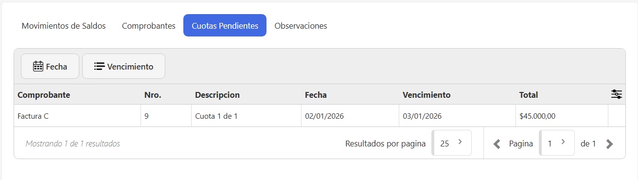 - Cuotas Pendientes: Detalle de pagos pendientes organizados por vencimiento.