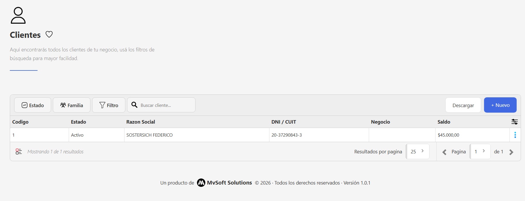 Una vez accedas, vas a ver el listado de todos los clientes cargados en el sistema. Para hacer una búsqueda específica, podés usar los siguientes filtros: