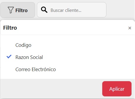 - Filtros: Código, Razón Social, Correo Electrónico, o Todos.