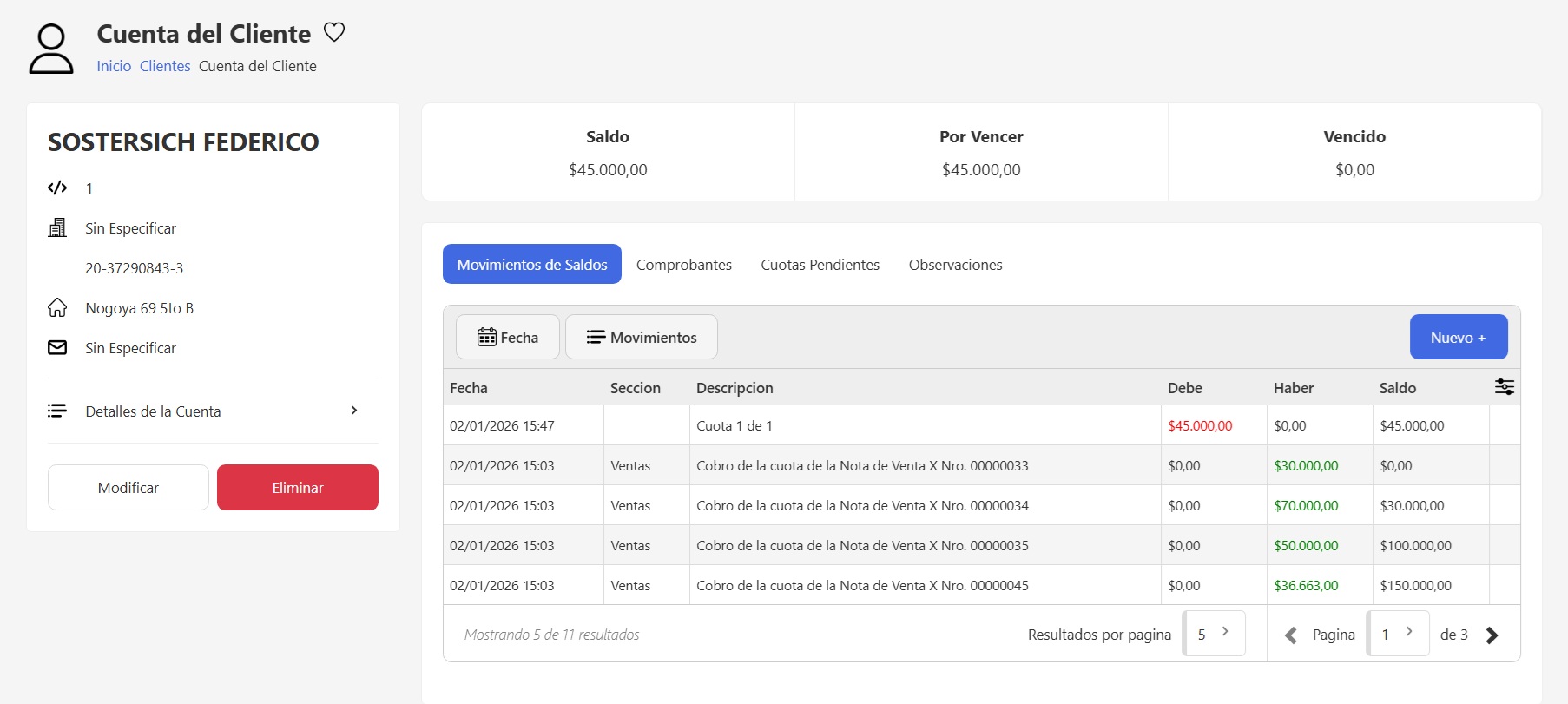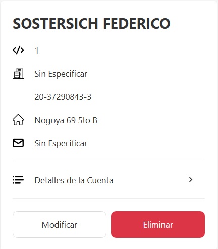 Al ingresar a la cuenta de un cliente, vas a encontrar a la izquierda sus datos principales: código, tipo y número de documento, dirección, y correo electrónico.