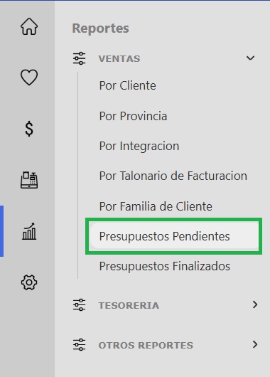 - Accedé al panel de gestión: Ingresá a tu sistema y, desde el menú lateral izquierdo, dirigite a la sección Reportes, seleccioná Ventas -> Presupuestos pendientes.