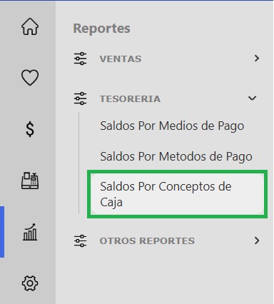 - Accedé al panel de gestión: Ingresá a tu sistema y, desde el menú lateral izquierdo, dirigite a la sección Reportes, seleccioná Tesorería -> Saldos por Conceptos de Caja.