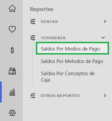 - Accedé al panel de gestión: Ingresá a tu sistema y, desde el menú lateral izquierdo, dirigite a la sección Reportes, seleccioná Tesorería -> Saldos por Medios de Pago.