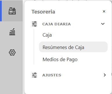 Para ver los resúmenes de cajas que ya fueron cerradas ingresa en el panel de funciones que se encuentra a la izquierda, en el módulo Tesoreria ➜ Caja diaria ➜ Resumenes de caja.