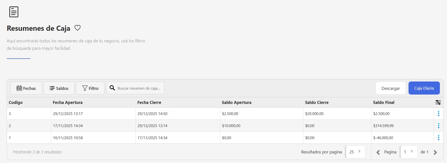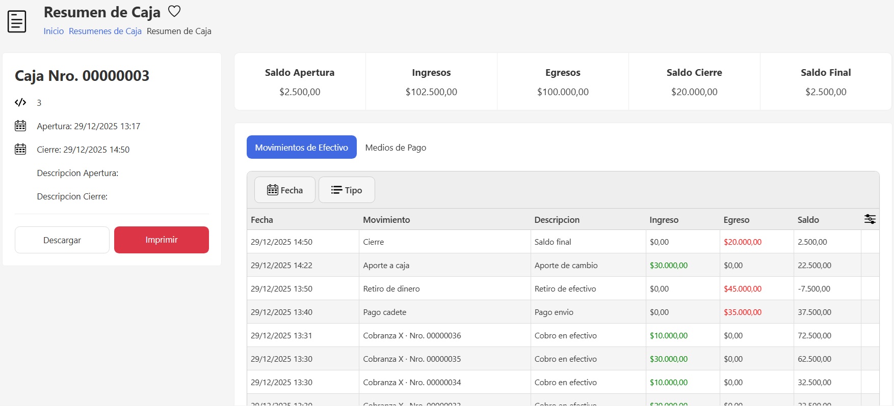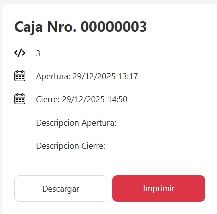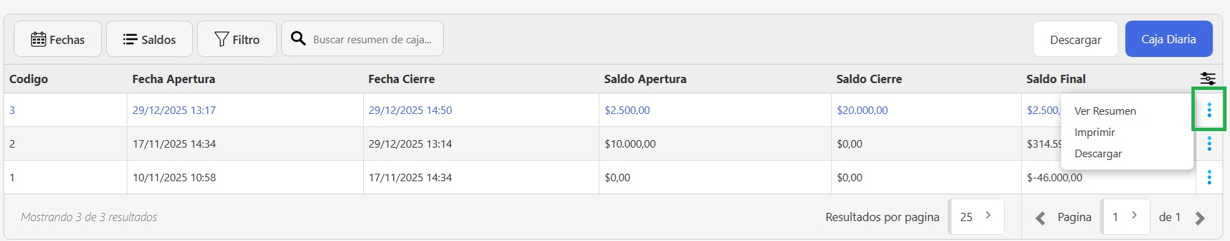 Si necesitas descargar o imprimir un resumen de caja, podes hacerlo desde las opciones (3 puntos) en el listado de resumenes de caja