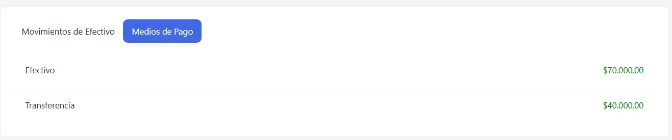 En esta sección vas a encontrar detallado los medios de pago y sus totales que fueron utilizados en esta caja.