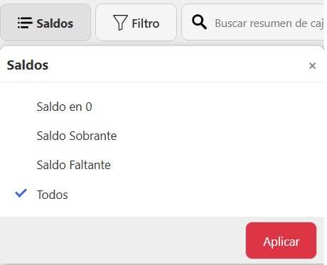 Una vez accedas, vas a ver el listado de todos los resumenes de caja con los datos de Fecha de Apertura, Fecha de Cierre, Saldo de apertura, Saldo de Cierre y Saldo Final. Para hacer una búsqueda específica, podés usar los siguientes filtros: