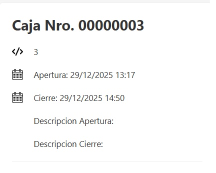Al ingresar al resumen de caja vas a encontrar en la parte izquierda sus datos principales: código, número, fecha y hora de apertura, cierre y descripciones.