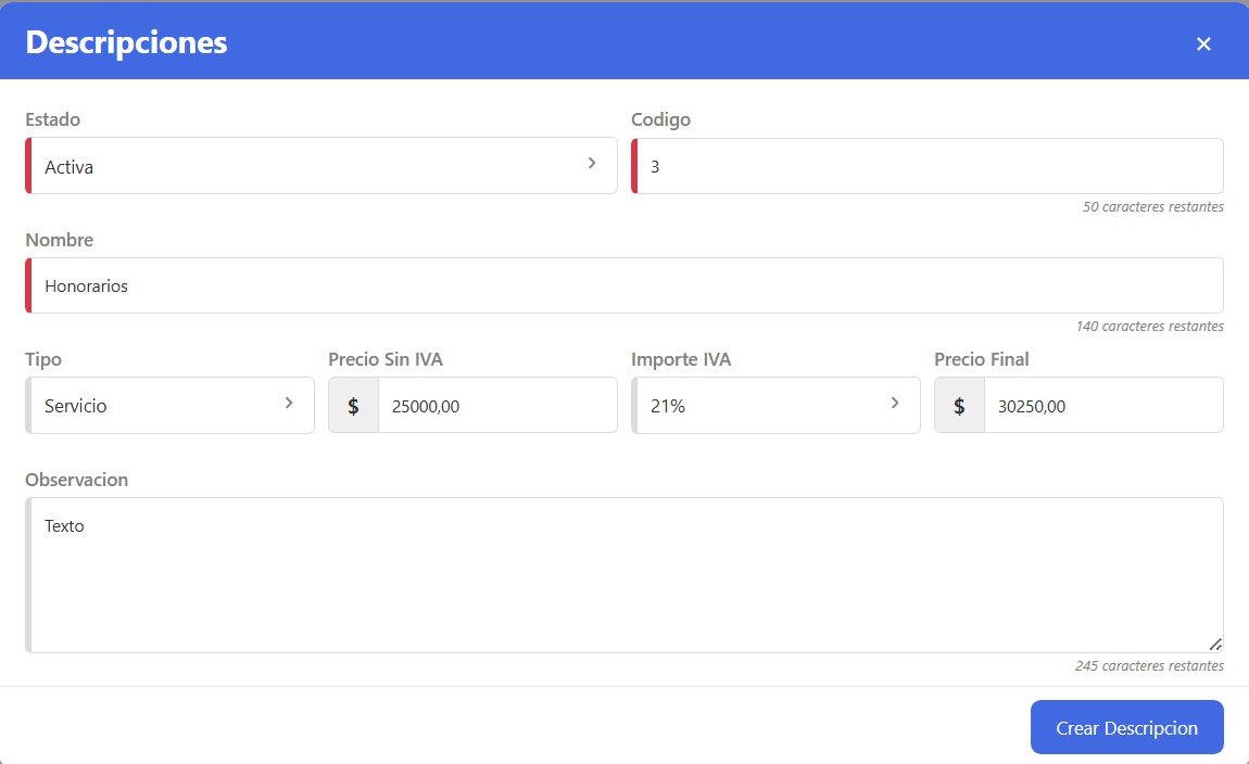 - 👉 simplemente buscás la descripción predefinida y la agregás a la factura.