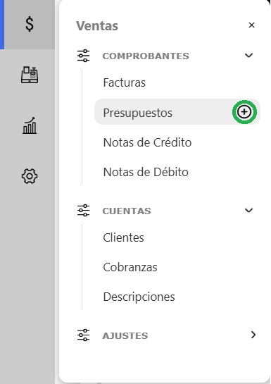 Para generar un nuevo presupuesto ingresa en el módulo de Ventas -> Comprobantes -> Presupuestos + y hace clic en el "+".