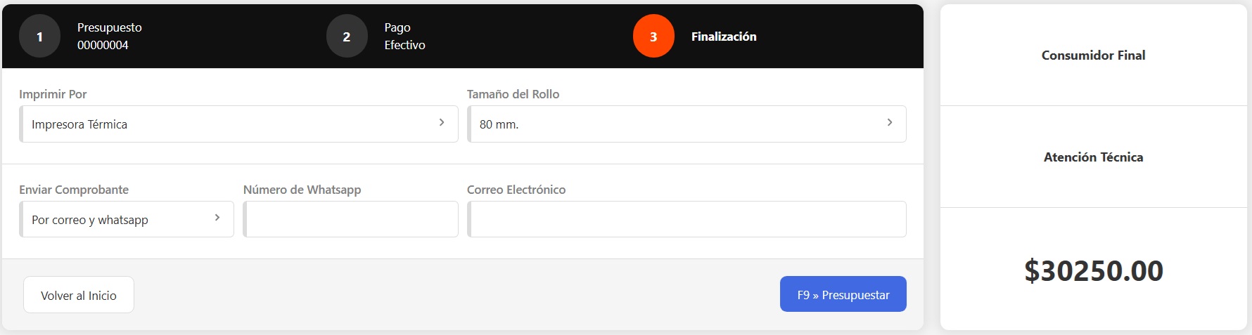 Es la última pantalla antes de generar el comprobante, donde tenes opciones de impresión y envío