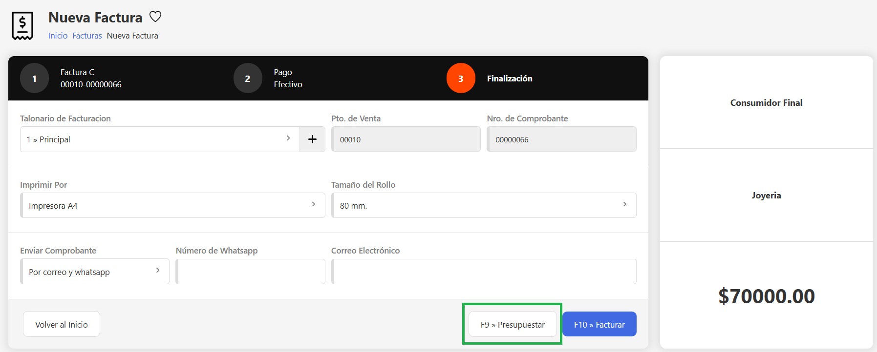 Estando en la sección de Nueva Factura, en la pantalla de finalización vas a tener la opción de presupuestar.