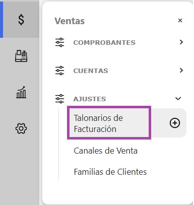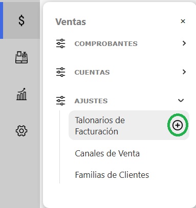 Para administrar tus talonarios ingresá en el panel de funciones de la izquierda en: Ventas → Ajustes → Talonarios de Facturación. Luego hacé clic en el botón + para crear un nuevo talonario.