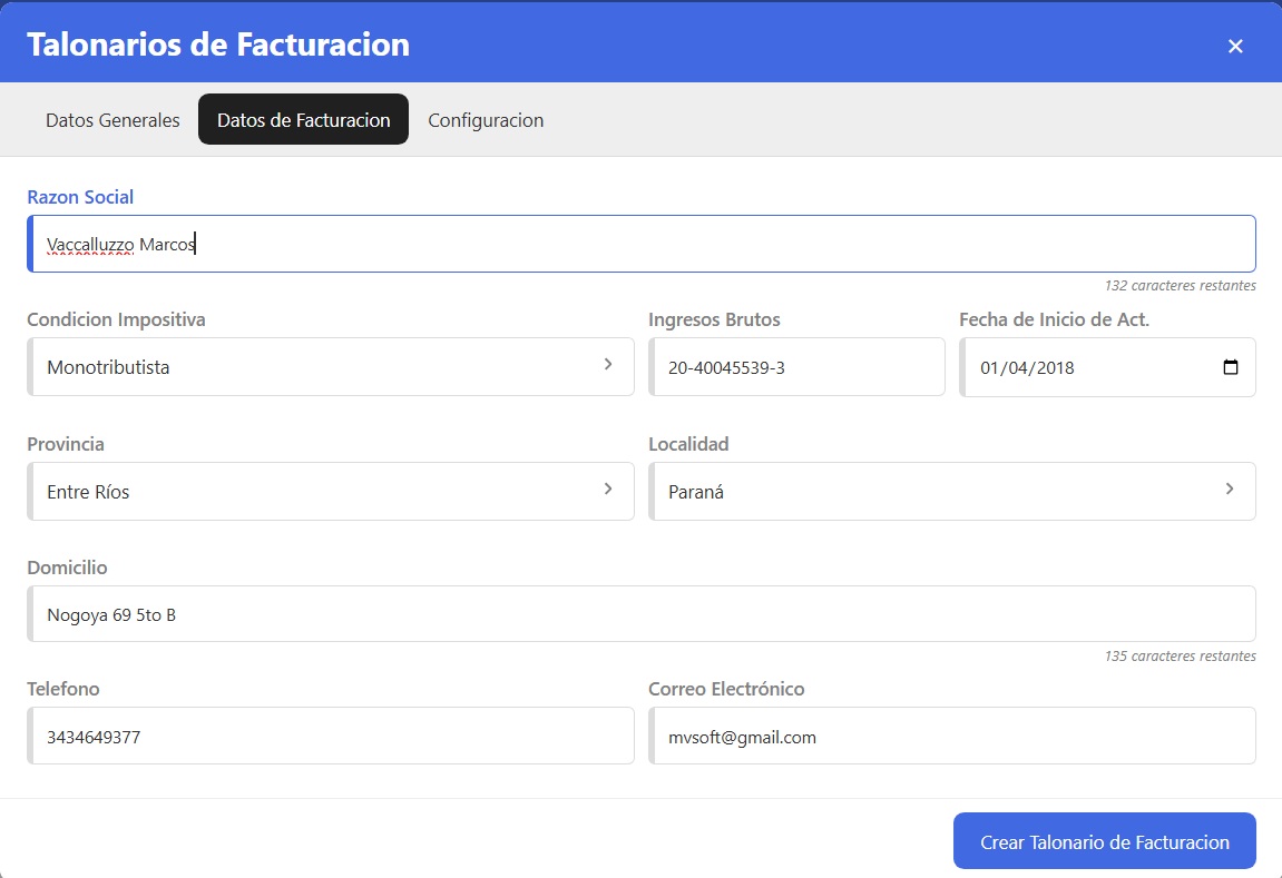 Una vez que hayas completado toda la información en las tres pestañas, hacé clic en el botón Crear talonario para guardar los cambios. A partir de ese momento, el talonario estará disponible para ser utilizado en tus operaciones de facturación.