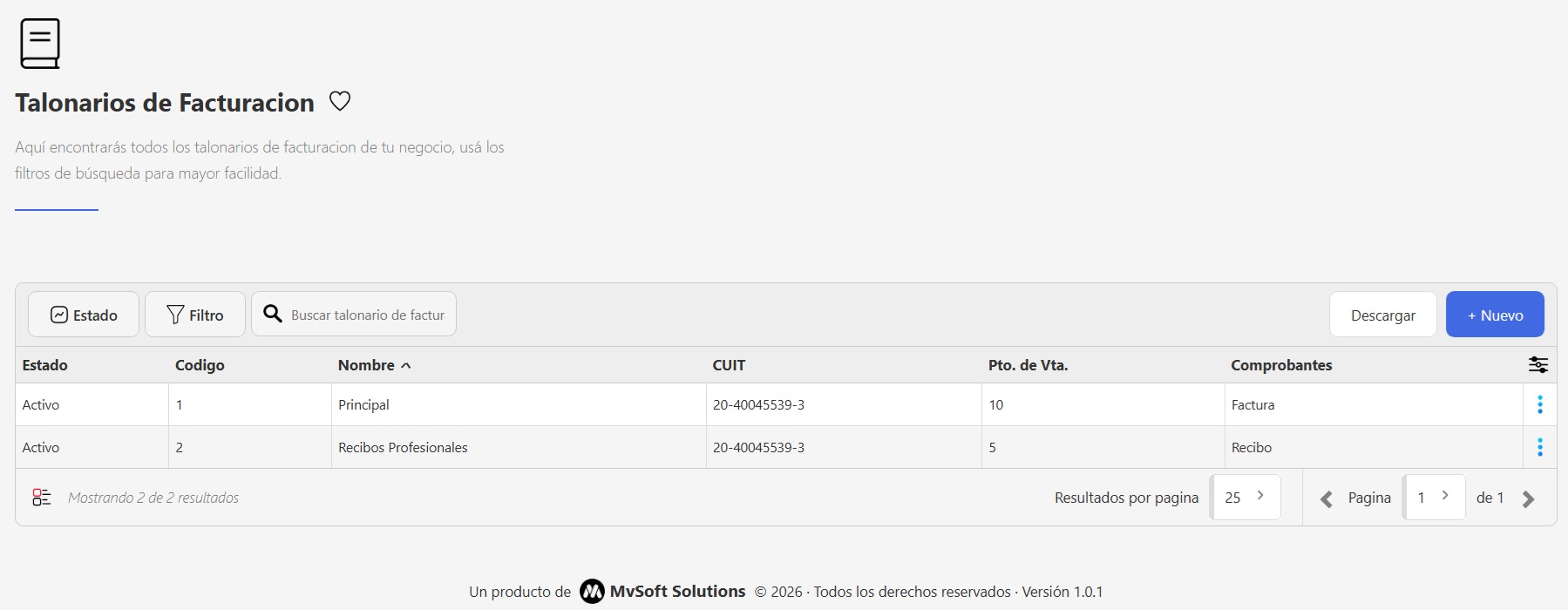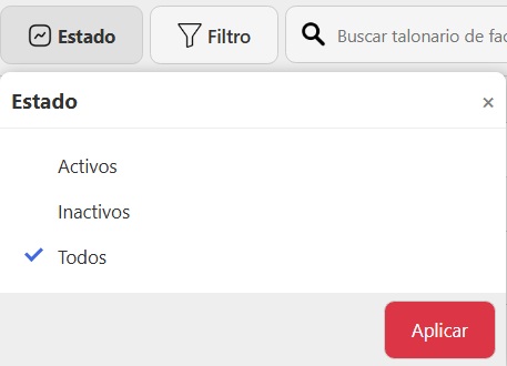 El sistema te mostrará todos los talonarios cargados y además podrás aplicar filtros de búsqueda: