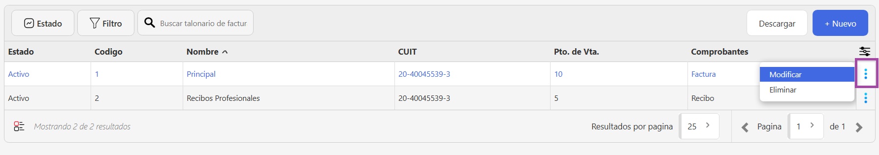 Cada talonario puede ser modificado haciendo clic en los tres puntos a la derecha de la fila o directamente sobre el talonario que quieras editar.